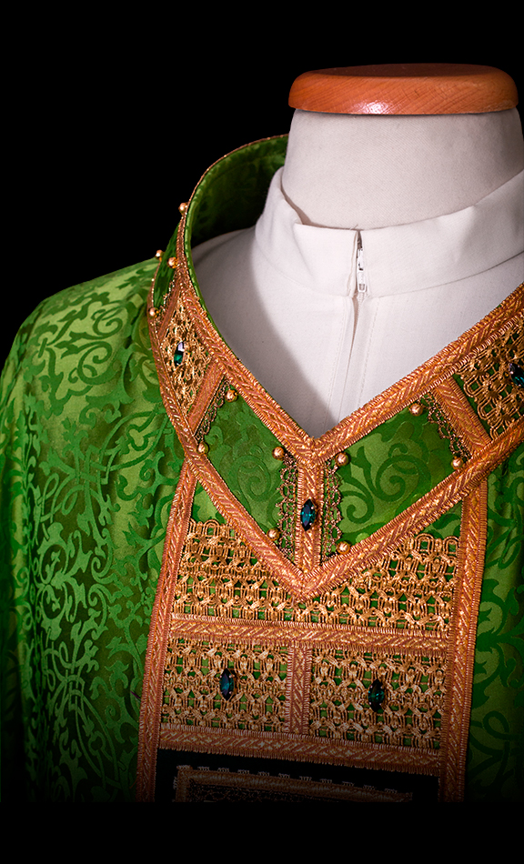 Casula con tessuto in acetato viscosa. Stolone rifinito con pietre swarovsky incastonate, perline oro e inserti in metallo. Quadrato in velluto rifiniti con bordini croce e perline oro. Collo rigido a V rifinito con pietre Swarovsky incastonate, perline oro e bordini.