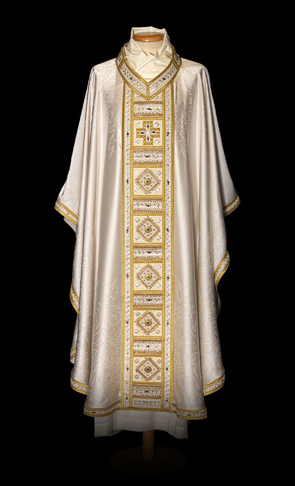 Casula con collo a V, tessuto di nostra produzione in 65% acetato 36% viscosa. Stolone ricamato, rifinito con passamaneria, inserti in metallo e pietre Swarovsky.